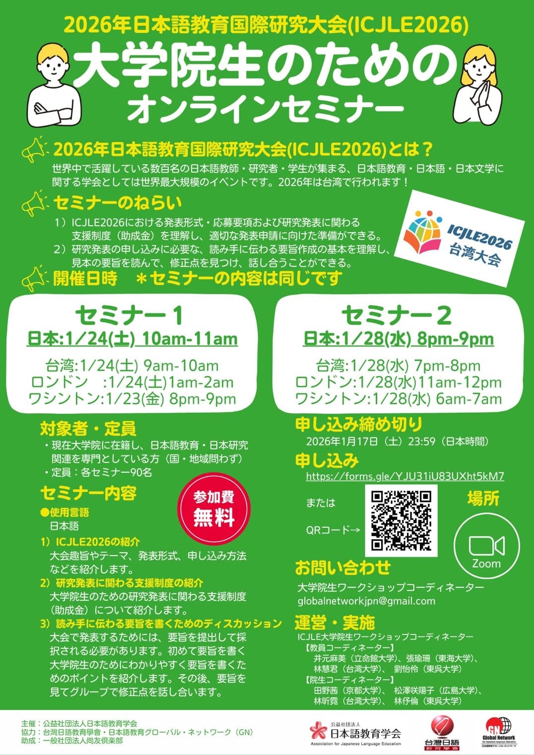 【ご案内】2026日本語教育国際研究大会(ICJLE2026・台湾大会)詳細は「ポスター」、「ICJLE2026ホームページ」をご覧ください。